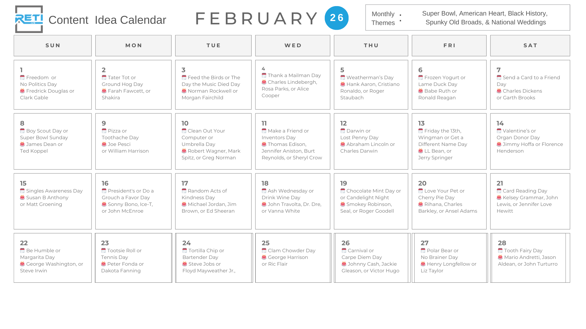 RETI Content Idea Posting Calendar for February 2026